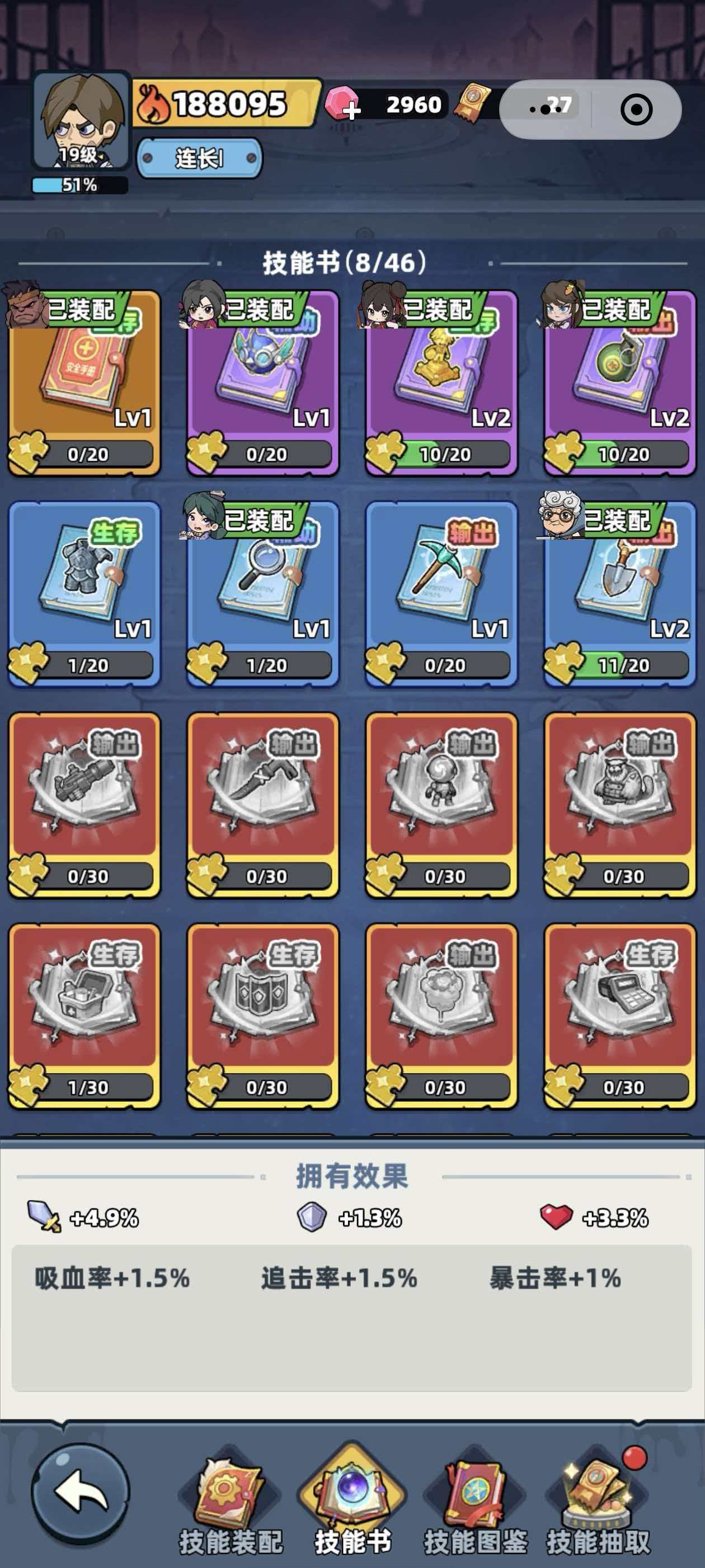 想要提升角色战斗力除了给角色升级以外,使用技能书也是重要的方式之一,玩家获取的技能书越多,那角色的战斗力也就会越强,游戏中当前的技能书一共分为输出、辅助、生存三大类,而技能书又分成了金红色、红色、橙色、紫色以及蓝色等多个颜色,金红色的技能书是品质最高的神话+级别,红色为神话级别、橙色为传说、紫色和蓝色的话则分别是史诗和精良,技能书的品质不同装备上所产生的效果肯定也是不同的,给角色带来的属性加成也是不一样的,大家需要根据角色的定位来选择合适的技能书才行。