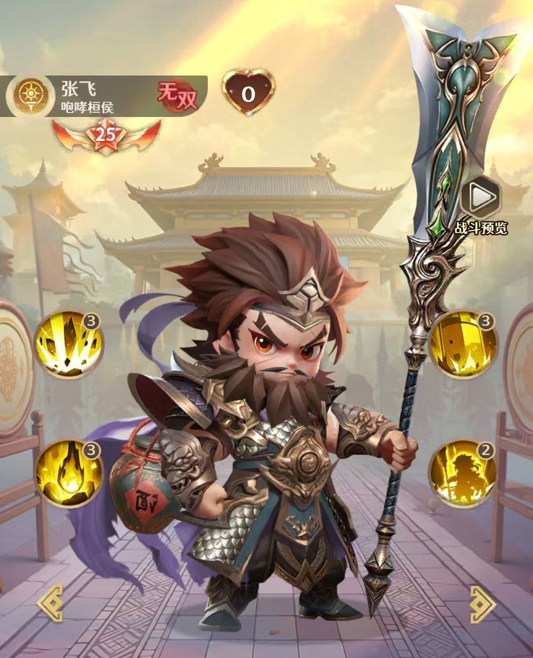 张飞属于游戏中混沌系无双武将中获取门槛最低的一档,无需复杂活动或高额投入即可入手,对零氪及微氪玩家尤为友好。其一技能可对敌方全体目标造成物理伤害,并附加真实伤害;若该技能直接击杀任一敌方单位,则额外触发一次真实伤害,具备显著的清场潜力。大招则兼具输出与生存双重功能:对敌方全体施加高额物理伤害的同时,按比例恢复自身生命值,并赋予“刚猛勇烈”状态,每层提供伤害加成与减伤效果,最多可叠加两层,有效强化持续作战能力。