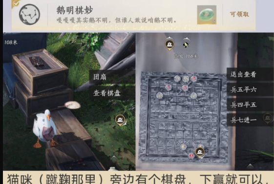 在《燕云十六声》的周年庆趣味活动“怪盗一只鹅”中,玩家将扮演大鹅在清河镇完成系列任务,活动共隐藏9个成就。其中成就【鹅明奇妙】的获取方法是:在地图指定位置找到棋盘,并依次选择“兵四平五”“兵五平六”“兵七进一”三步棋即可完成。