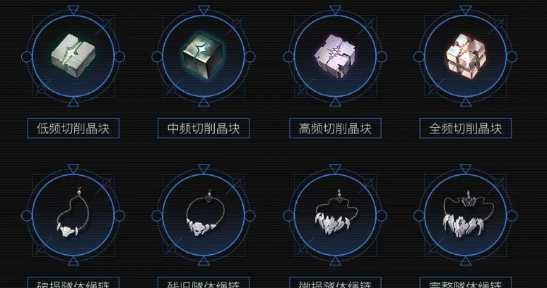 武器突破所需材料包括破损隧体绳链、低频切削晶块、中频切削晶块、微损隧体绳链以及完整隧体绳链,各阶段具体数量配置可参考下方图示说明。
