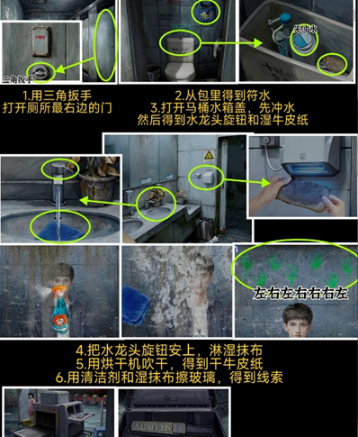 6、观察厕所玻璃里面的荧光手印,按照“左右左右右右左”的顺序依次点击安检口地上工具箱的左右按钮.