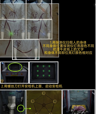 4、根据安检机显示器上黄色便签的标红文字线索,按照“上下止工二正”的顺序依次调整椅子上假人怀中的匣子机关.