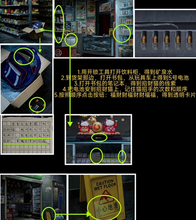 1、进入便利店,拉开货架旁边的书包小包,玩具车掉落后,获得五号电池.