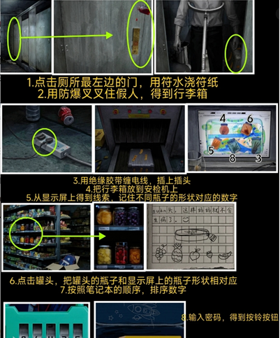 9、安检显示屏里的瓶罐形状可以以和小卖部货架上的水果罐头形状相对应,由此可知“黄桃罐头-4,葡萄罐头-8,菠萝罐头-6,草莓罐头-3,橘子罐头-5”在查看小孩日记本上的简笔画水果顺序,得知数字组合为“86435”,在文具袋处输入密码.