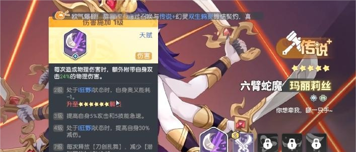 首推角色为六臂蛇魔——玛丽。该角色属传说品质,定位为前期核心战力。其核心机制在于“狂野状态”:进入该状态后,奥义技消耗降低,同时提升全队减伤比例。这一双重增益使其兼具输出续航与团队生存保障能力,在开荒阶段表现极为稳定,是资源有限时最值得优先投入培养的限定角色之一。