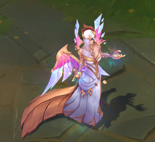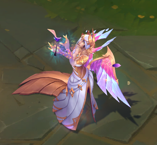模型方面,手上不停向外散发出彩绘玻璃样子的光效,模型底部有亮光,身体周围会有闪光粒子和水晶碎块。