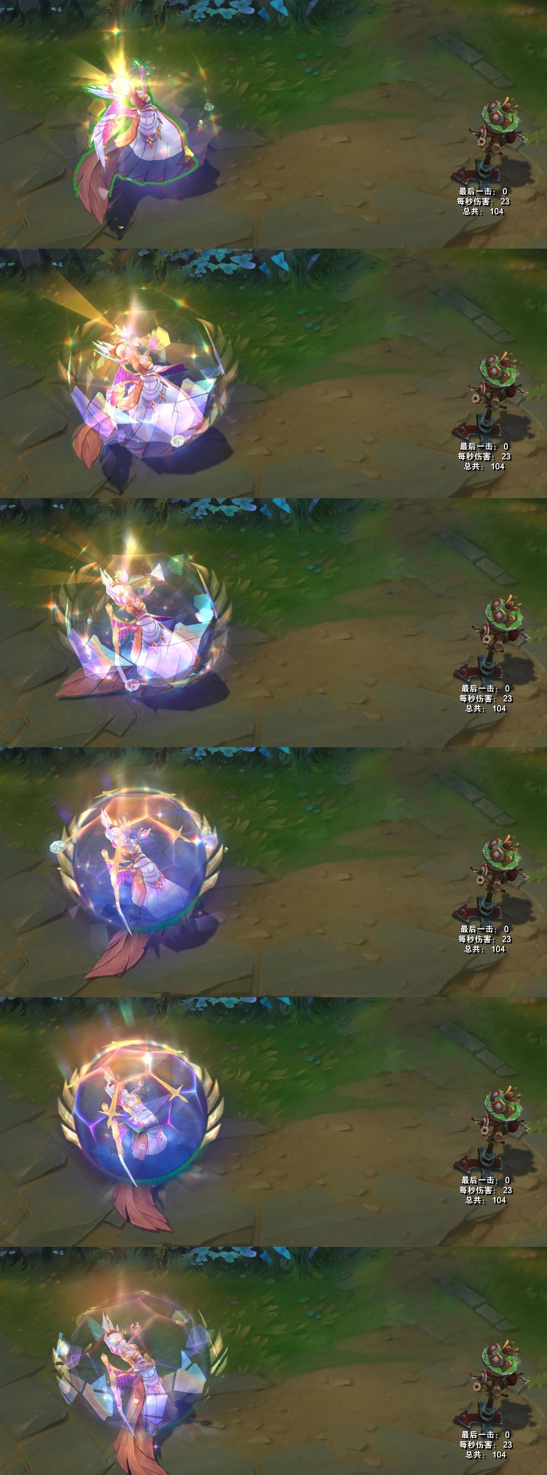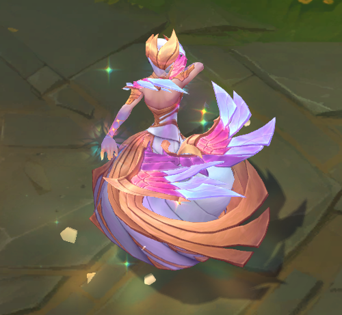 E技能,一开始手上金色的亮光,保护盾一点点出现,由玻璃碎片构成,护盾两侧有钻石和碎片环绕旋转,尖刺像是翅膀一样,消失时,玻璃碎片碎裂。
