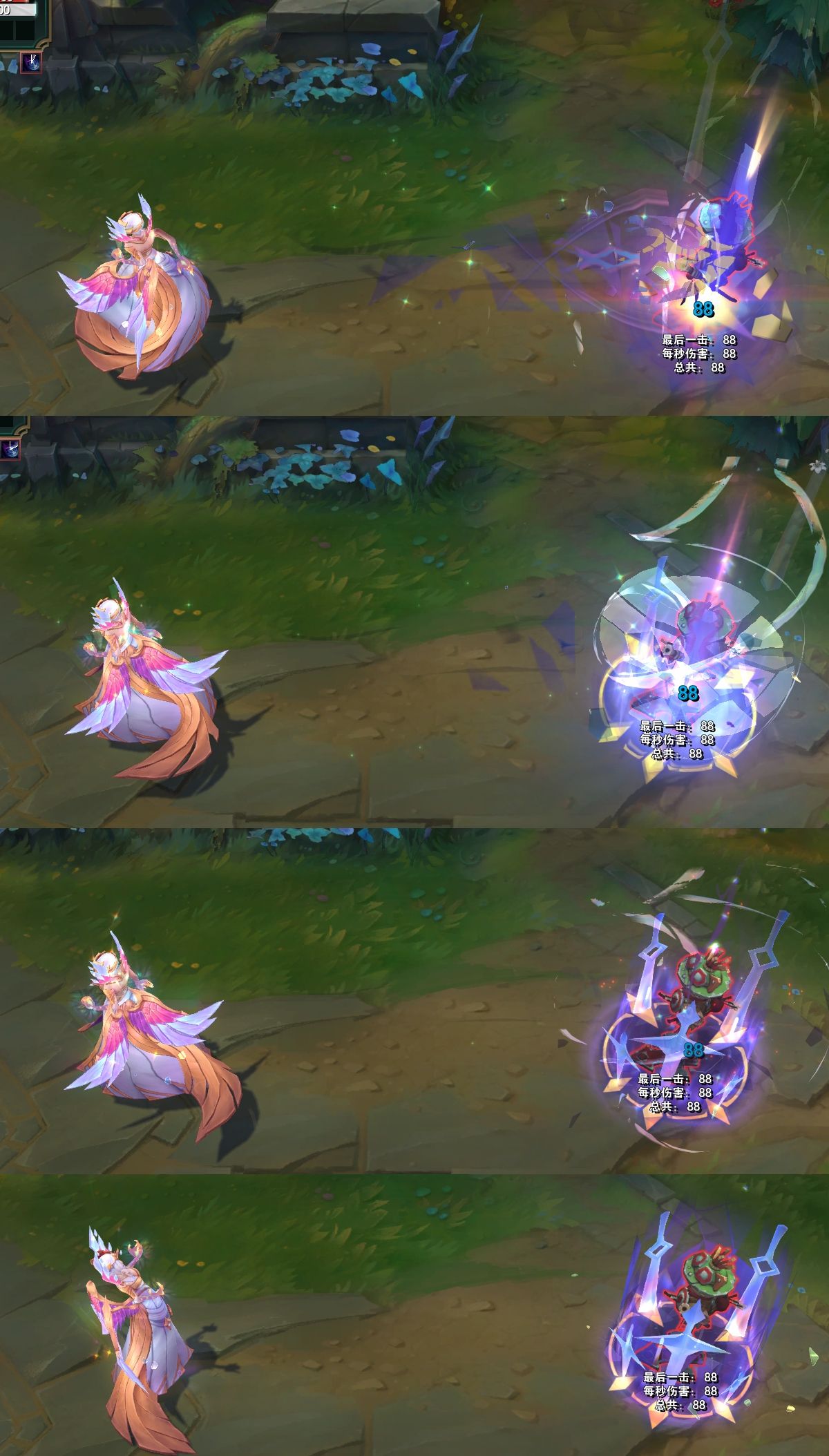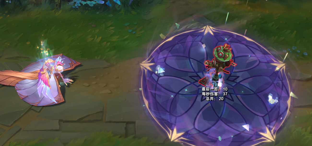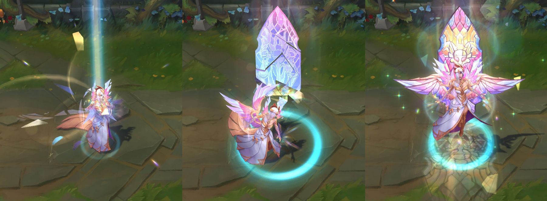 W技能,一把剑从天而降,地面上出现青绿色的亮光以及光晕,区域内是彩绘玻璃的图案,表面还会出现一些钻石。