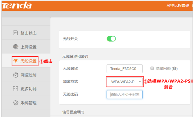 tendawificom路由器无线密码怎么设置,在电脑上打开浏览器,在地址栏输入tendawifi.com或192.168.0.1,然后按回车键(键盘上的Enter键),登录路由器管理界面后,点击“无线设置”-修改“无线名称”选择“WPA/WPA2-PSK混合”-输入8位数以上的无线密码。