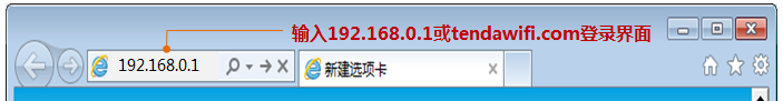 在电脑上打开浏览器,在地址栏输入tendawifi.com或192.168.0.1,然后按回车键(键盘上的Enter键),如下图所示:
