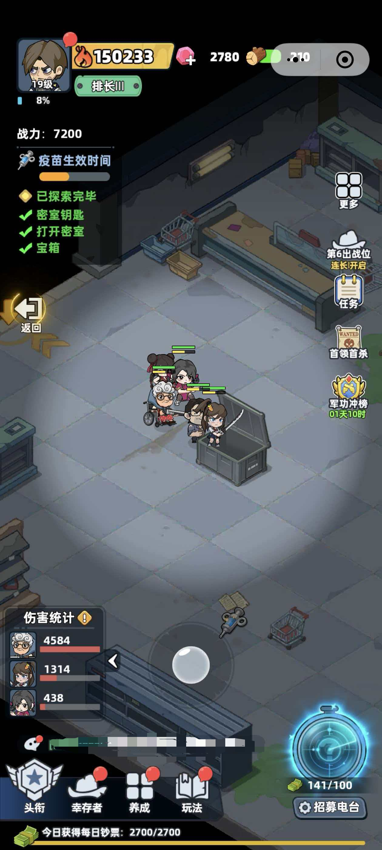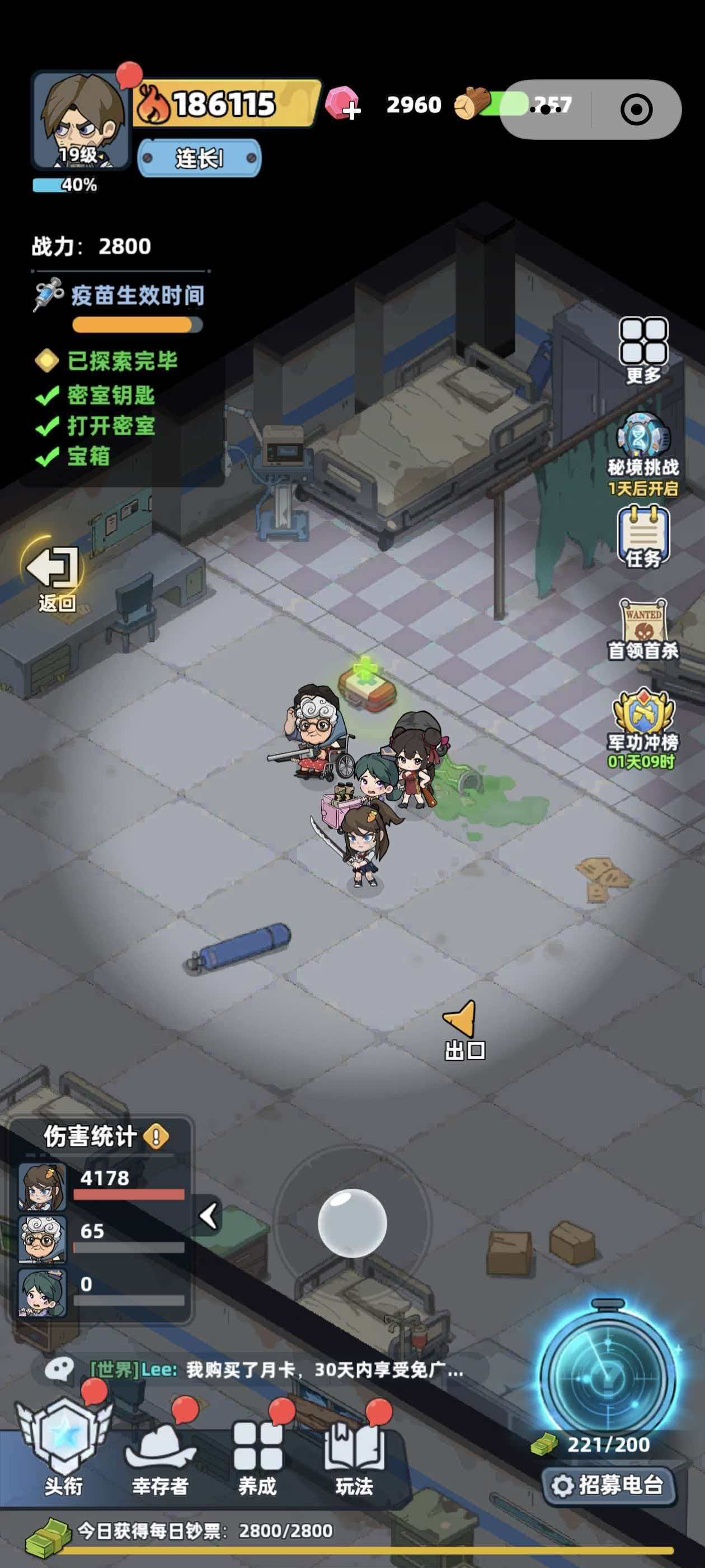 接下来就是看当前室内会有几个宝箱,室内的宝箱数量都会明确的给瓦玩家标出来,大家只要一间一间物资的去尽心探索就可以了,医院这里就是进入以后,先注册疫苗,然后会有僵尸出现,把僵尸给打败以后,玩家会获得钥匙,然后进入到左侧的房间内,会看到有一个宝箱,打开宝箱以后会获得技能书的抽卡券,之后推出房间,在向右侧的房间移动,房间内会出现僵尸,玩家在把僵尸击败以后,又会拿到开宝箱的钥匙,接下来就是用钥匙开宝箱了,等这个宝箱拿完以后,玩家就需要回答中间的走廊位置,在一直往前走,往前走时会在地上看到掉落的钥匙,捡起来以后,一直走就会在最里面的房间内看到宝箱,用捡到的钥匙把宝箱给打开就可以了。