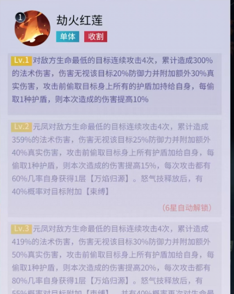 二技能在战斗开始时给我方全体添加一层凤羽效果,并对敌方全体造成一次伤害,当伤害可无视护盾,且给元凤对位的目标附加焚心,降低其受到的治疗效果,增加受到的伤害,风羽这个效果可以提升最终伤害,加强我方全体输出。被动技能除了提高攻击、生命和伤害之外,当元凤受到一次致命伤害时,为我方全体清除负面状态,同时自身还能复活,这样相当于多了一条命性,容错率非常高。