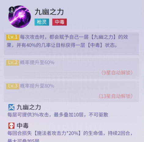 最后一个九幽之力,在每次攻击时都可以叠加一层九幽之力,并有几率让目标获得一层中毒。每层九幽之力都能够提供3%攻击加成,最多叠加10层,对方中毒之后就会是持续损失生命值了。