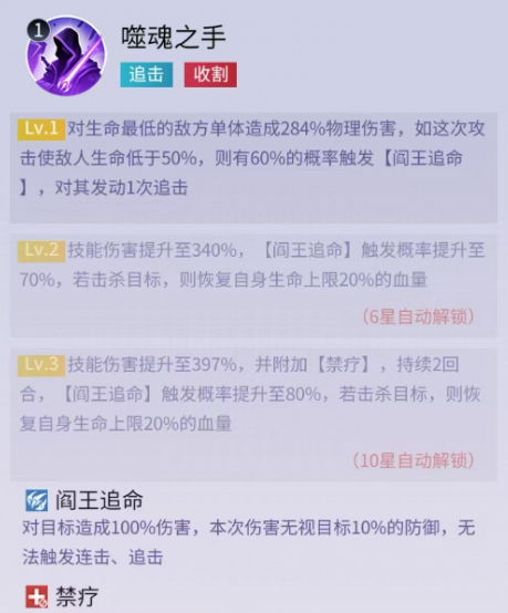 技能方面,一技能是噬魂之手,锁定对方血量最低的单体目标,造成高额物理伤害,如果使用本次攻击使敌人生命值降到半血以下,就有几率触发阎王追命,再发动一次追击。阎王追命可以造成100%伤害,且无视部分防御,但此效果就无法再次触发连击和追击了
