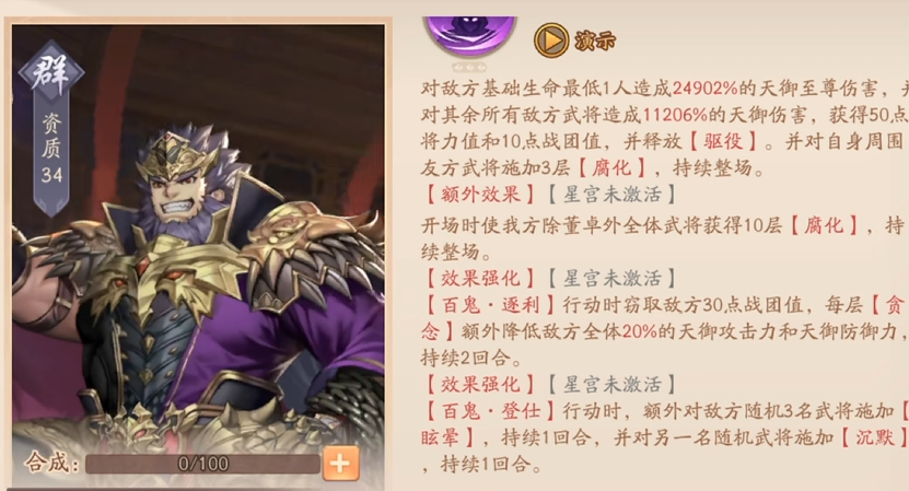 从上文中小伙伴们不难看出,董卓其实是一个非常值得培养的角色,虽然说他的定位是坦克,但是他的技能描述和数值使得他的输出其实也是比较可观的,小伙伴们也可以把他给当成副C来培养。并且在生存能力这方面,各位同学也是完全不用担心的,即使说你的手上暂时没有吕布,也可以让董卓单独上场,他的恢复机制能够让他即使是在面对群攻的情况下,也能扛很久的一段时间。
