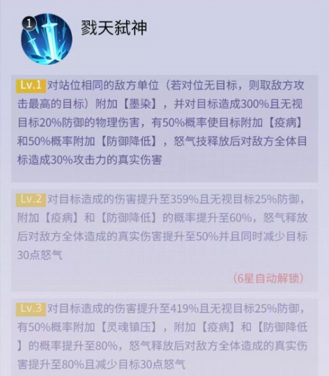 罗睺属于游戏中的魔族战士,具有的变身能力在战斗中非常有优势。第一个技能可以给站位相同的敌方单位附加墨染效果,并对目标造成高额伤害,且无视部分防御,还有几率使目标附加疫病和防御降低。在怒气技能释放后,敌方全体目标都会受到一次真实伤害。给对方附加的墨染可降低命中率,同时接下来会成为罗睺优先攻击目标。