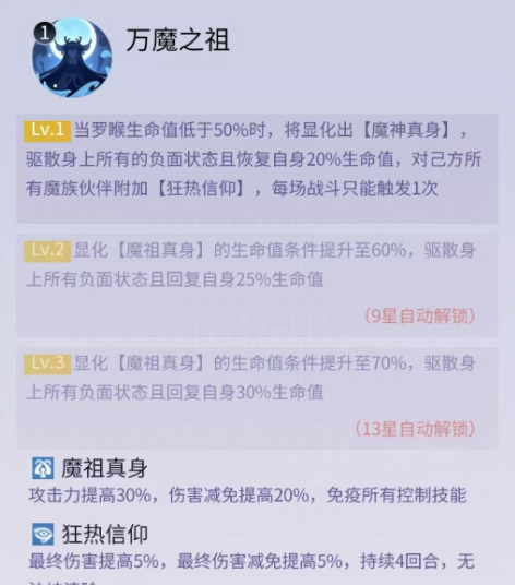二技能效果是战斗开始直接对全体目标造成一次伤害,并根据伤害值百分比给己方全体施加护盾,将敌方场地转化成魔域,魔域可以降低对方速度,这样我方就有了速度方面的优势。大招效果是在生命值低于半血的时候,直接变成魔神真身,将身上的所有负面状态清除,恢复自身生命值,其他的魔族伙伴都能附加狂热信仰,提高最终伤害。