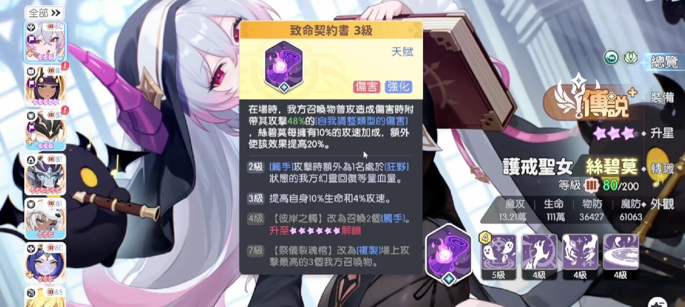 在战斗的过程当中,如果丝碧莫如果成功的召唤了召唤物,他的普通攻击技能会附带额外的伤害,通常7天天赋是质变,可以使他的奥义技能快速的复制场上攻击最高的4个召唤物。而这样的情况下,能够有效的让敌人当前的生命值受到伤害,并且治疗效果跟伤害自己队伍的将会有效的加成,玩家在召唤触手进行攻击跟治疗的时候,触手其实会继承丝碧莫的大部分的属性,这时候玩家自己队伍的实力将会大部分加强,并且当他施展了特殊技能之后,还可以将奥义伤害进一步的提升。
