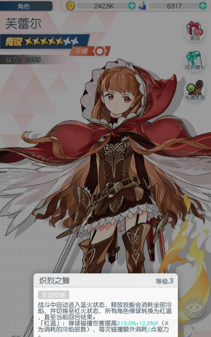 第三个为大家推荐的是芙蕾尔,芙蕾尔在当前的强度上面也是被大家用作一个基础C位来使用的,她如果放在冲撞效果里面使用的话,利用自己的技能可以大幅度提升自身的一个被动伤害,而且利用自身的弹力效果可以带来的驱力,也就是碰撞次数也会更多一些,所以放在这里的话,芙蕾尔觉醒了之后再来一个大幅度提升,觉醒会让她的伤害数值更高一些,所以在冲撞队里面,芙蕾尔如果放在主要核心输出位置上面使用的话,对于一些boss类型的敌人来说是非常适合针对使用的,当然芙蕾尔有这么强的能力,同时弱点肯定也是有的,就是对球的特技效果上面是没有其他技能效果那么好叠加起来的,这一点大家就要依靠其他的队友来进行叠加。