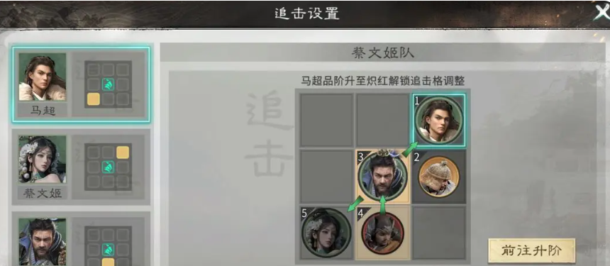 然后张辽的话,在这里可以带白虹贯日之类的技能,对面的敌人造成输出的时候,是根据所在行列的敌人,对他造成输出之后还可以根据张辽自身天赋带来足够的点杀能力,后期追击的话,大家可以带横刀耀武,这个技能对敌方目前武力数值最低的一个目标来说,造成的伤害是能够达到最高数值的,蔡文姬在这个阵容里面就是辅助定位的角色,她能够带来的一个主力技能就用鼎力相助技能,这样的话就可以让踩中追击格子的武将带来足够的伤害加成。