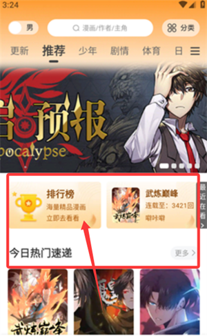 2、首页设有排行榜等入口,点击即可浏览平台精选漫画作品。