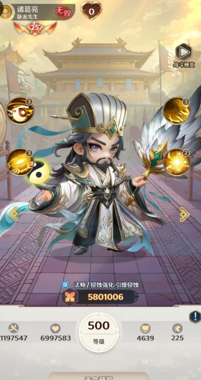 诸葛亮也被称作为卧龙先生,达到无双品质的他很是好用,在当前的法师定位当中主要依靠自身的侵蚀强化这类优势带来输出,而且他身上还有一些引爆侵蚀的能力可以用,第一个技能是天罡星斗,这个技能使用的时候可以让诸葛亮挥动自己手中的羽扇,攻击的目标是敌方全体,给全部的敌人都造成92%的法术伤害,此时如果是已经有携带了混沌侵蚀的目标,那么诸葛亮在自身的暴击概率上面后会有提升20%的数值,此时还可以直接触发目标身上所有混沌侵蚀状态,在此之后更有35%概率再一次添加混沌侵蚀,混沌侵蚀这个状态就是他主要的一个用法,一般在敌人身上生效的时候是在2回合之内都会使这个目标损失攻击力50%的生命,后期叠加起来之后绝对是非常强势的输出技能。
