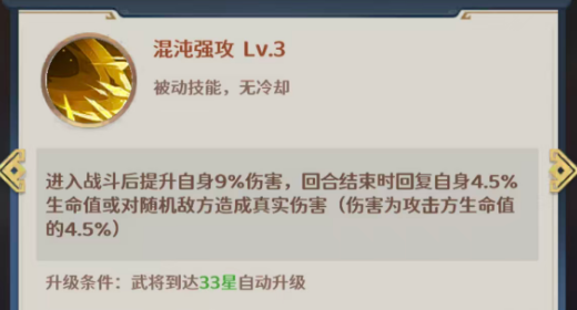 混沌强攻这个技能是进入战斗后提升诸葛亮自身9%的伤害,而在回合结束的时候,还可以回复自身4.5%生命值或对随机敌方造成真实伤害,这里的真实伤害数值是攻击方生命值的4.5%,这个技能升级条件是在武将到达33星的时候会自动升级的,所以也是从根本上就解决了法师的续航问题,另外是进入战斗的时候诸葛亮就有机会可以获得9%的增伤,这个数值虽然看起来不高,但是回合结束的时候也是有更多的灵活性可以选择,如果是诸葛亮自己血量健康的话,这里可以选择对随机敌人造成生命值4.5%的真实伤害,如果是对坦克类型的敌人用还是很好的,另外如果是在残血状态当中的话,这里4.5%的回血又能保证诸葛亮的生存效果不受影响,所以诸葛亮其实是不算占用治疗位的,如果是他带队的话容错率也会更高。