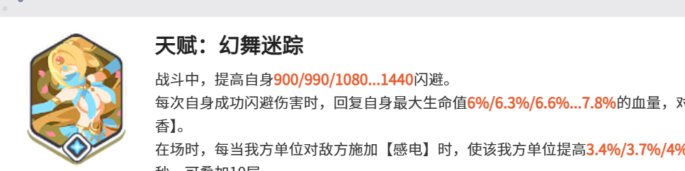幻舞迷踪就是角色的天赋,这是立足战场的根基,在战斗的过程中,最高可获得1440点闪避加成,让他很难被击中,每一次都可以成功的闪避,可以获得7.8%的最大生命值回复,还可以给敌人附加醉步迷香的状态。更厉害的是,我方单位在施加感电时,还能获得5.2%的增伤以及减伤的叠加,最多可以叠加10层。当天赋提升到7级时,满城醉步迷香触发的中等范围5秒魅惑,搭配30%最大生命值回复,总是可以在危局中逆转乾坤,只是每一个目标在15秒内只能触发一次。