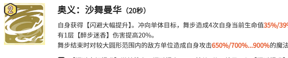 沙舞曼华是奥义技能。拥有一个20秒的冷却,让莎乐美可以获得8秒90点的闪避加成,冲向目标的四记舞步,每一次都能够打出当前生命值最高55%的魔法伤害,敌人身上每一层的醉不迷香,还可以让伤害再提升20%。舞步终章会造成大范围的攻击,同时还会拥有着900%的大范围魔法伤害,可以给自己增加两层遗言。在攻防转换之间就可以展现出锋芒,还有一个16秒冷却的绝技雷舞流沙,是一个有防御有输出的技能,在开启之后就可以获得最高43%的最大生命值护盾会有12秒的持续时间。
