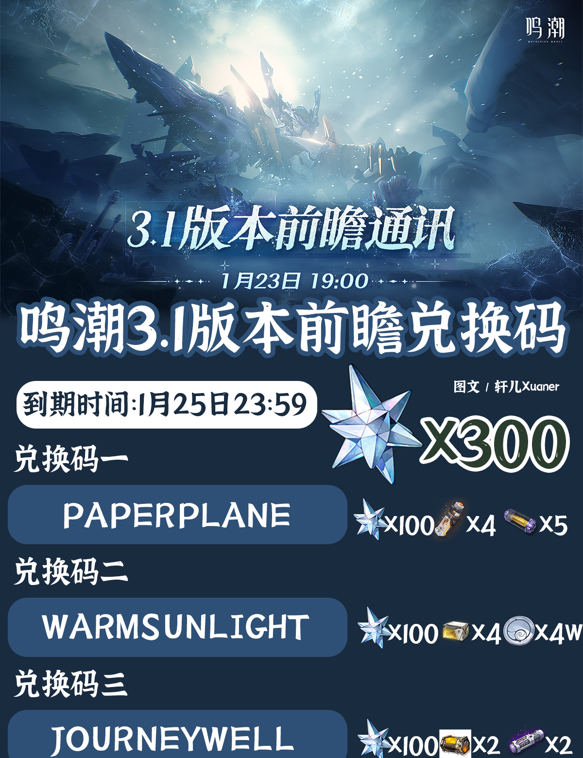 鸣潮3.1版本前瞻通讯三个兑换码,2.17-3.19登录即领1600星声和头像!