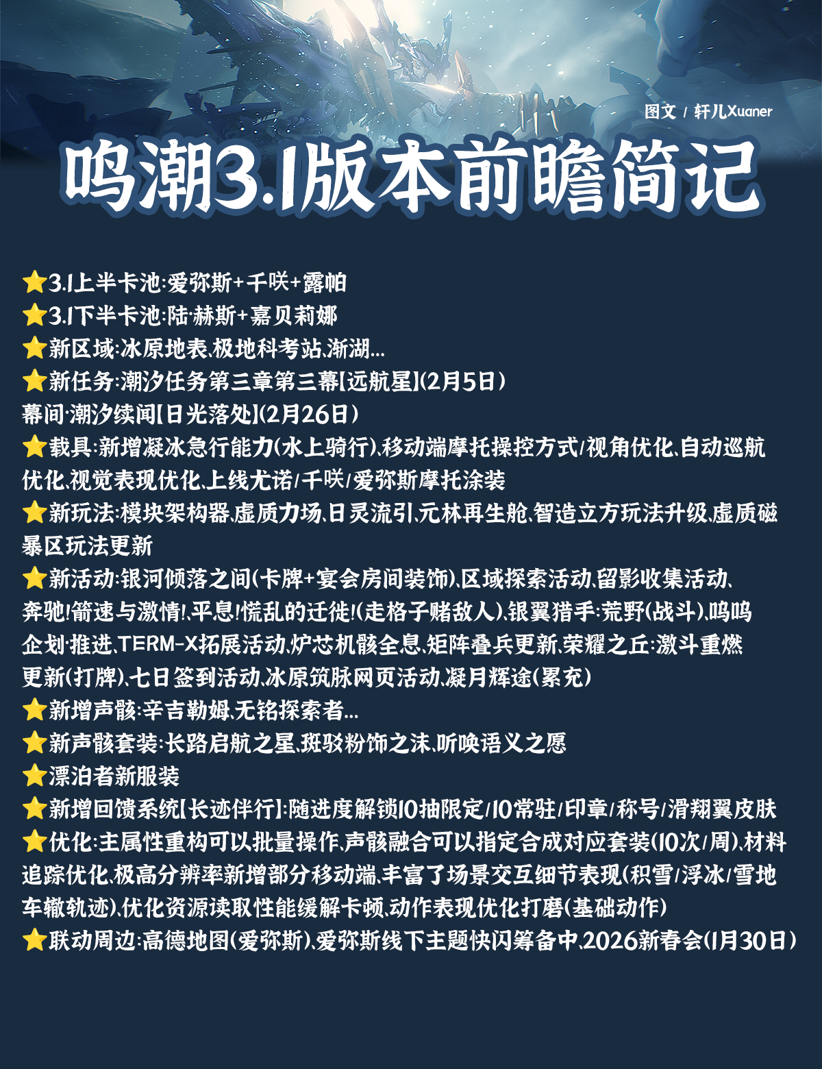 新活动:银河倾落之间(卡牌+宴会房间装饰)、区域探索活动、留影收集活动、奔驰!箭速与激情!、平息!慌乱的迁徙!(走格子赌敌人)、银翼猎手:荒野(战斗)、呜呜企划·推进、TERM-X拓展活动、炉芯机骸全息、矩阵叠兵更新、荣耀之丘:激斗重燃更新(打牌)、七日签到活动、冰原筑脉网页活动、凝月辉途(累充)