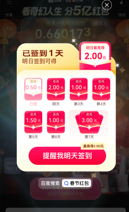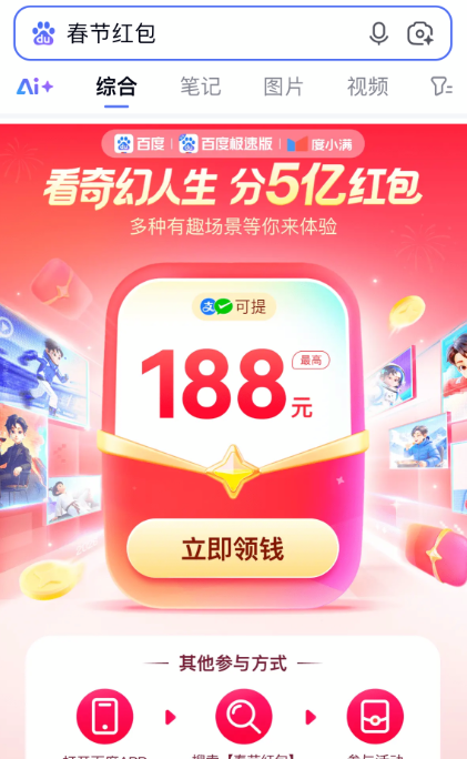 2026年百度APP春节红包活动已开始。用户可搜索“春节红包”参与:体验“奇幻人生”AI互动并集卡,前1000名集齐5张稀有卡可赢最高万元现金;每晚20点还可通过文心助手猜口令抢隐藏红包,最高得1088元。活动持续至2月24日。