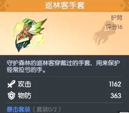 这件护臂类装备专精暴击向成长路径。提供1162点橙色攻击(即暴击伤害加成)、363点物理防御,同时直接增加200点暴击率数值。作为暴击套装的关键拼图,它能大幅缩短暴击阈值,尤其适配以普攻或瞬发技能打出高额暴击伤害的物理系角色。
