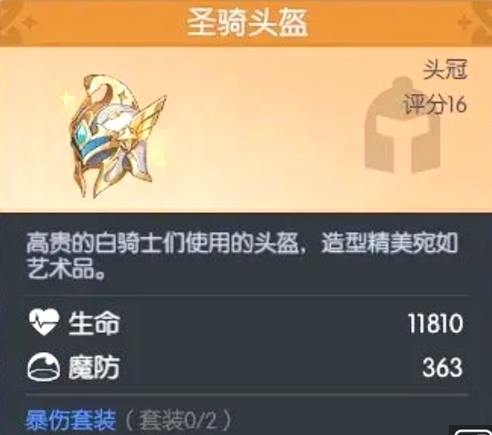 白骑士职业标志性头部装备,兼具美学设计与实战价值。基础属性为11810点生命值与363点魔法防御,属于暴击伤害强化类套装部件。穿戴后可提升18%暴击伤害,与巡林客手套形成协同效应,共同构成高爆发物理输出链路的重要支撑。