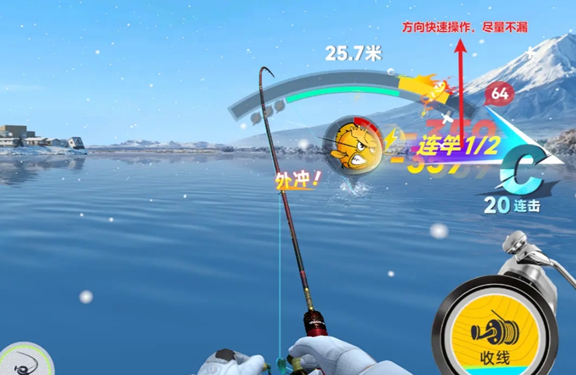 4、同时,玩家需用左手操作连竿,屏幕上会出现左右连竿箭头。连竿能够增加收线能量条,连击不宜遗漏,这样能最高效地攒出最高级的破空收线。