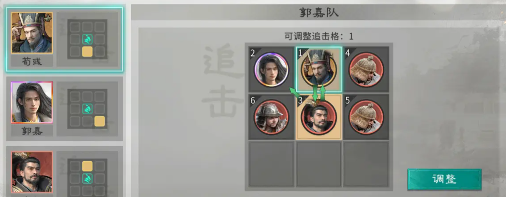 站位方面,建议前排配置藤甲兵承担稳定承伤任务;后排优先部署单穿杨军,利用其高穿透特性补足队伍整体输出缺口。袁绍需主动占据荀彧与郭嘉的追击格子,以高效触发“王佐之才”的追击增益效果,大幅提升自身技能释放次数与连动频率。需注意:郭嘉无需踩格,其定位为技能型副C,重点在于状态叠加与残血收割。