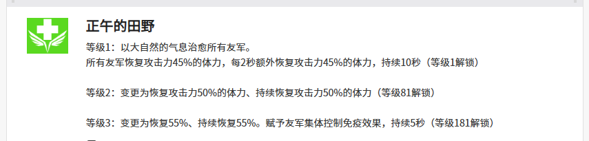 比如克拉拉在第一个技能正午的田野当中,可以带来所有友军身上都带来治疗的效果测试给全体队友带来恢复的数值,是根据她攻击能力上面45%的数值,带来这样数值恢复之后还可以每隔两秒之外,额外回复体力数值,持续10秒的时候,可以给所有的队友带来的恢复数值也是比较高的累积百分比,另外这个技能后期提升到等级三的时候,这里可以恢复的数值基础就达到了55%的数值,后期还可以给所有的友军都带来集体免疫控制的能力,当然克拉拉达到181等级的时候才可以解锁这个技能三的强度。
