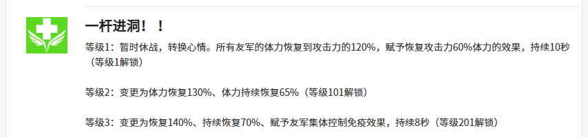 如果想要暂时休战的话,大家其实可以用的是克拉拉的一杆进洞技能,这个技能使用的时候,可以将所有友军的体力恢复到根据攻击力提升到120%的数值上面,这样有足够体力的时候还可以带来的一个效果会更强势一些,另外她后期带来的持续时间也有10秒时间,大家可以完全作为先手使用的状态来进行使用,后期接其他的输出技能是最好的。