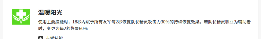 最后就是克拉拉在使用自己支援技能的时候,会有一个温暖阳光的被动,也就是团队的增益技能可以触发,触发这个技能的时候,她持续的被动效果有18秒时间,在此时可以赋予所有的队友恢复队长效果身上30%的持续治疗,当然如果是克拉拉作为队长的话,那么这里是可以为同为辅助者的角色,带来每2秒60%的一个恢复,所以在此时克拉拉带来的全队生存机制是非常高的。