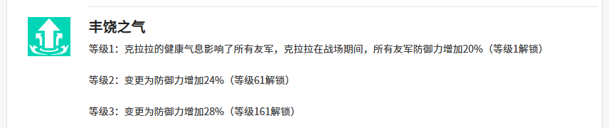 克拉拉还有丰饶之气的技能,这个技能效果其实是在场内期间有机会可以触发的,一般触发了这个丰饶之气之后,克拉拉可以针对所有我方队友身上的防御数值来进行提升,达到20%的提升之后,可以让我方在面对敌人输出的时候有更多的空间可以保证存活,那么在这里同样在最高的品质当中,能够达到的一个防御增加有28%,一般情况下是在敌方行动的回合才可以触发这个防御加成的。