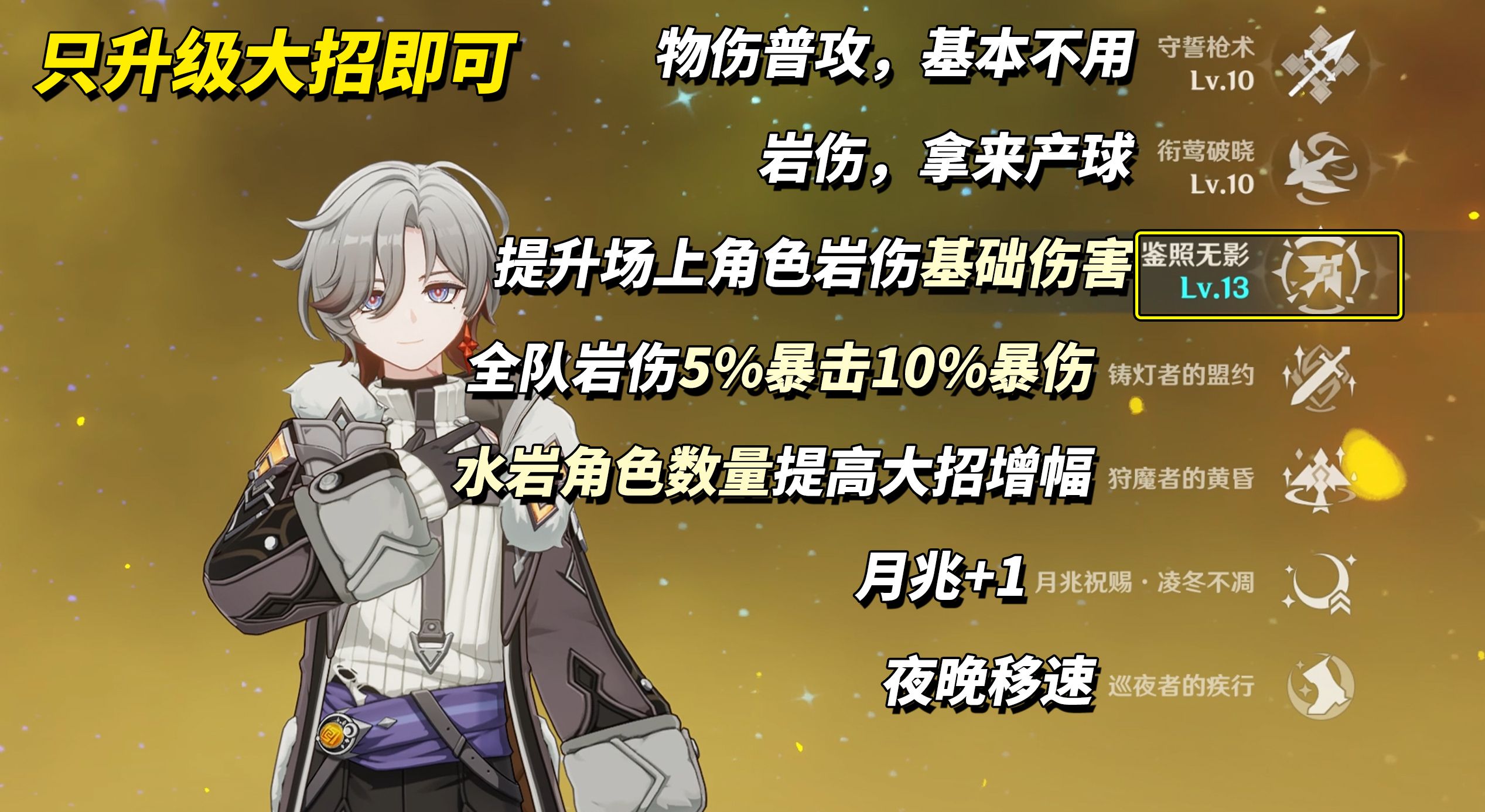 全队造成的岩元素伤害提高5%暴击10%暴伤,若满辉则额外提高50精通。