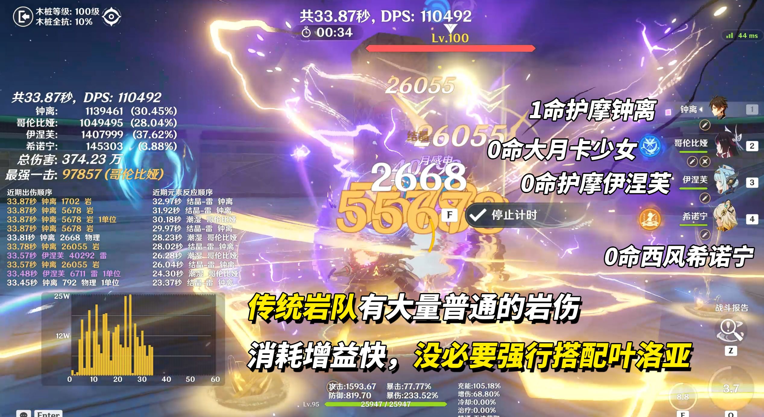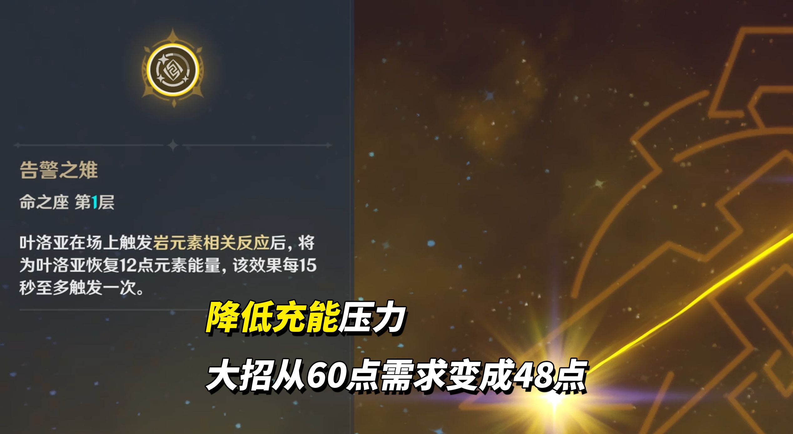 1命,叶洛亚触发岩伤后恢复12点能量。元素爆发是60点能量,可以降低充能压力(具体充能后面配装会讲)。