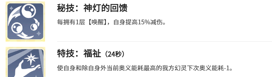 神灯的回馈这一个技能就可以让角色在守护他人时,照样也可以稳固自身,每拥有一层唤醒,就能够得到15%的减伤。叠加起来的减伤效果,让他在激烈战斗中不容易倒下来,可以获得持续的输出质量。福祉24秒冷却的特技成为团队的福音,可以给自身减少下一次奥义能耗,还可以选中自身奥义能耗比较高的队友。然后就可以降低奥义消耗,助力团队更快的积攒奥义,直接打出连锁爆发。神格愿力神盾就可以让治疗更有安全感,一旦将目标治疗至满血状态时,就可以额外附加自身15%的最大生命值护盾。
