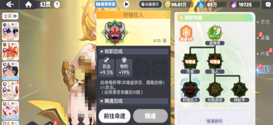 最后就是转职成狩猎狂人,这个属于斥候系的分支,转职成功后会获取物理防御以及攻击力的加成。机制特色则是每获取增益则增加一定程度的攻击力,并且需要叠层,最多只能叠10层,他在转职之后,无论是攻击力还是数值加成一类,他都比不上前两个职业,但是它的优势也非常明显,就是泛用性极强,适配度超高,在搭配多种增益阵容的时候。都有极强的适应性,而他本身攻击力不足的问题,则可以通过装备等词条来补充,在搭配方面的表现更为优异。