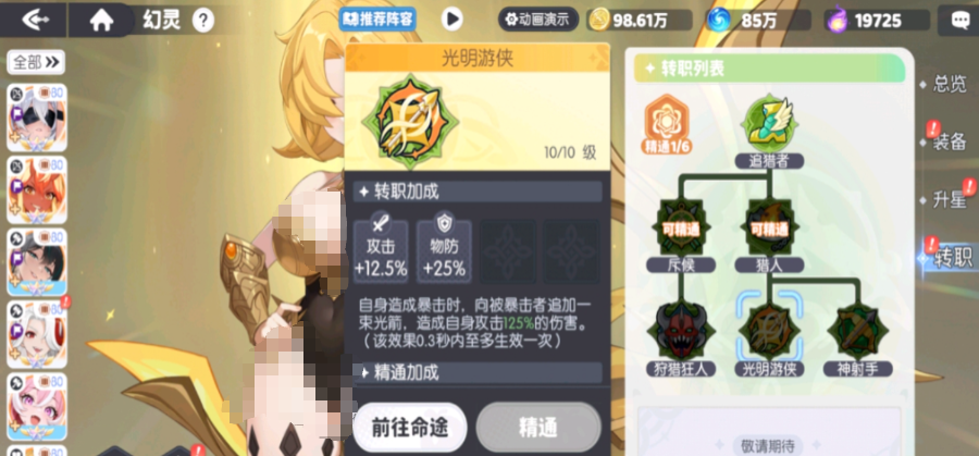 第2种转职职业则是光明游侠,光明游侠本身也是属于猎人系的路线,转职后提高的是攻击力以及物理防御加成,在转折后拥有着一个核心效果,就是在触发暴击之后,会直接追击敌人,是非常出色的反制能力,并且这个机制是不需要叠加层数的,转职成功后,他本身也会拥有着非常显著的物理防御,让他的持续作战有了更强势的表现。