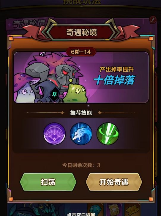 在玩家们通过1阶-5关卡后,便能开启历练玩法,与此同时奇遇秘境也会随着历练玩法一起开放。奇遇秘境是游戏给予玩家的一个福利副本关卡,每天可挑战三次,且支持直接进行扫荡。它里边的关卡难度会持平玩家所通过的最高难度普通关卡,比如玩家最高通关了3阶-15,那么奇遇秘境里的副本难度会与3阶-15关卡一样,但在掉落爆率上却为该关卡的10倍,每次挑战都有极大概率能获品质超高的装备,也是人们获取太古、远古装备的主要渠道之一,所以每天最好都将挑战次数用完,否则会非常的亏。