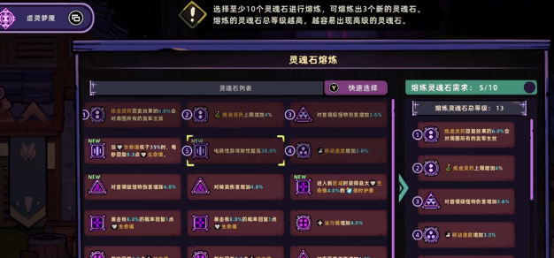 武器的方形槽主要是专门放防御类的灵魂石,目的是为了提升生存的能力,然后给输出提供保障。这里也给大家推荐通用并且实用的搭配,可以选择自愈或者是防护盾。自愈灵魂石对于新手而言就是一大福音,当角色血量比较低时,就可以触发每点一秒的持续回血效果。看上去好像并不高,但在紧张的战斗中,就可以靠着这微弱的回血一直撑到击败敌人,或者是找到补给道具,有效提升容错的几率。防护盾灵魂石在受到攻击时就有概率触发临时护盾,然后抵消一部分的伤害。
