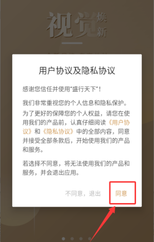 1、在盛行天下中点击"同意"用户协议,进入改版引导页面。