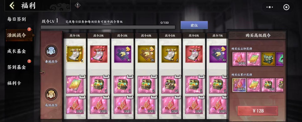 当然了,如果不氪金的玩家在这里是可以直接拿普通战令的各种奖励,愿意氪金的话,就是去购买高级战令就可以了,但是这个价格也是比较贵的,而且当前的战令点可以从每一天的任务以及每周任务宝箱当中直接领取战令活动,如果是有重置的话,在这里没有领取到奖励的玩家可以直接通过邮件来获取到自己的奖励,而在暂停活动重置的前面四天里面,大家也可以花费自己积攒的古玉,来购买这里的等级,每1级是需要消耗50古玉来进行购买的。