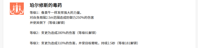 战斗当中的克罗伊在技能珀尔修斯的毒药上面,可以发挥自身力量的属性效果,在这方面上面克罗伊是有一定强度可以释放自身优势的输出,可以对周身范围2.5m之内的敌人都造成防御力上面250%的伤害,所以在她防御力越高的时候,这里250%能够带来的基础含量就更高,有一定的概率触发的状态是倒下,只要敌人倒下的话,那么后期受到的影响就会更多。